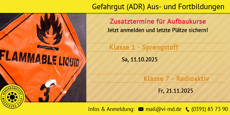 ab sofort sind die Termine für ADR Basiskurse und ADR Auffrischungskurse sowie für Sonnabendstermine für die Berufskraftfahrer-Qualifikation (Module) online. Buchungen sind ab sofort per E-Mail (mail@vi-md.de) möglich. Für weitere Fragen freuen wir uns auch über einen Anruf unter 0391857390.