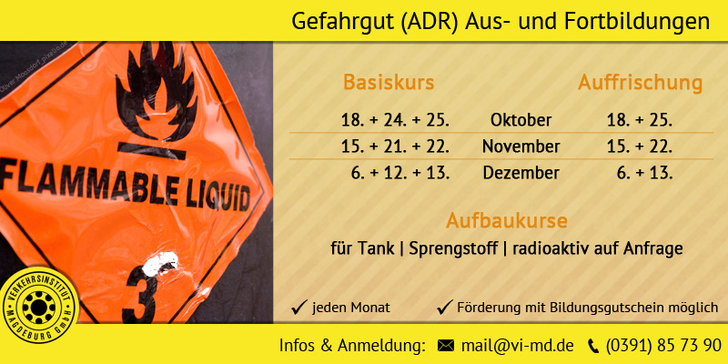 ab sofort sind die Termine für ADR Basiskurse und ADR Auffrischungskurse sowie für Sonnabendstermine für die Berufskraftfahrer-Qualifikation (Module) online. Buchungen sind ab sofort per E-Mail (mail@vi-md.de) möglich. Für weitere Fragen freuen wir uns auch über einen Anruf unter 0391857390.